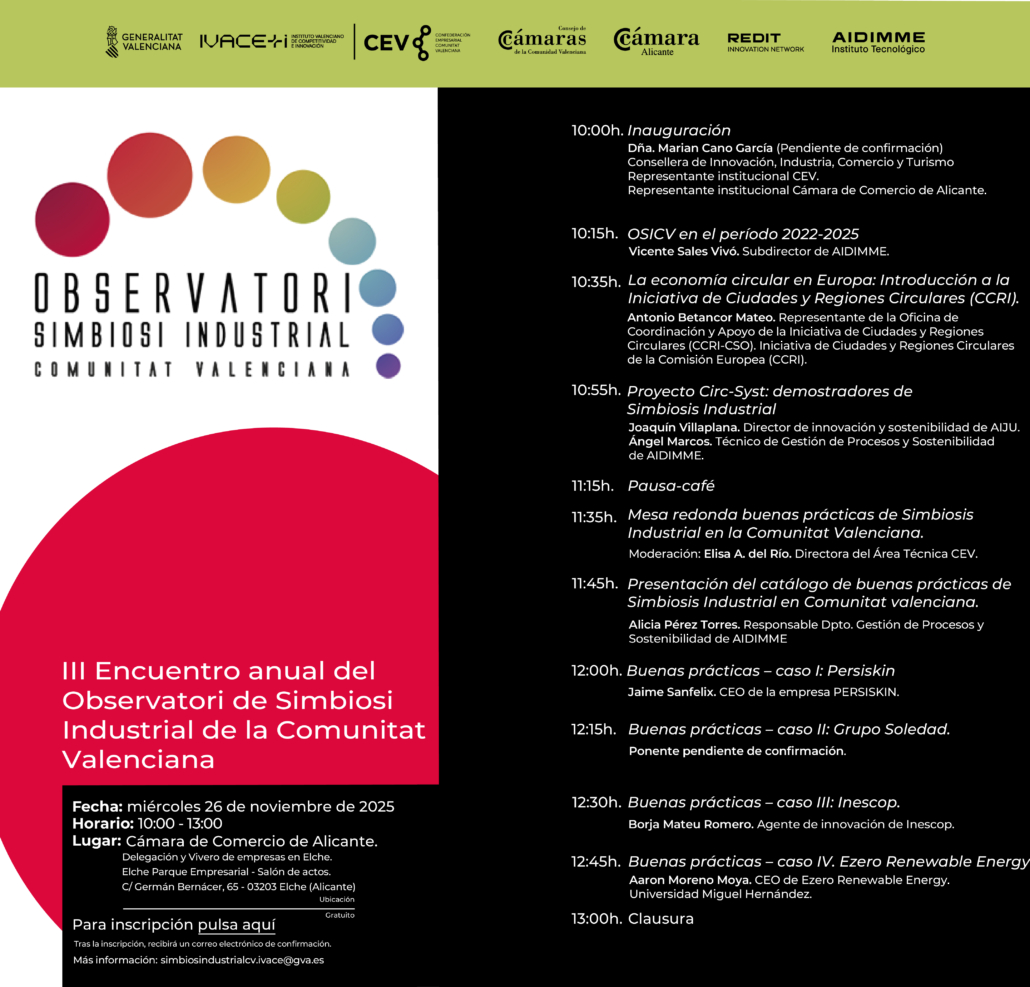 El pròxim 26 de novembre de 2025 se celebrarà la III Trobada de l’Observatori de Simbiosi Industrial de la Comunitat Valenciana (OSICV), una cita de referència que reunirà representants del teixit empresarial, associacions sectorials, instituts tecnològics i administracions públiques amb l’objectiu d’impulsar la cooperació entre empreses i avançar cap a models de producció més sostenibles i eficients.